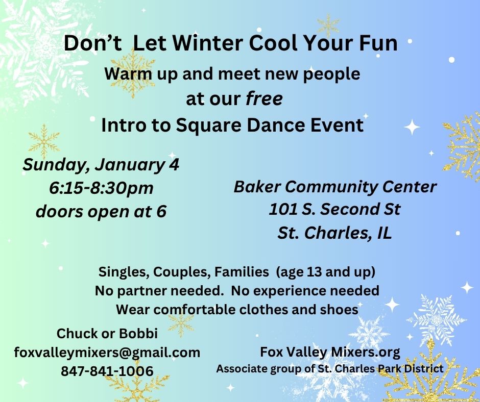 Flyer | St. Charles | Bobby Poyner | N/A | Intro to Square Dance, Baker Community Center, 101 S. 2nd St. (Rt. 31), 6:15-8:30 pm, Doors open at 6, Casual dress, comfortable shoes No partner needed |
